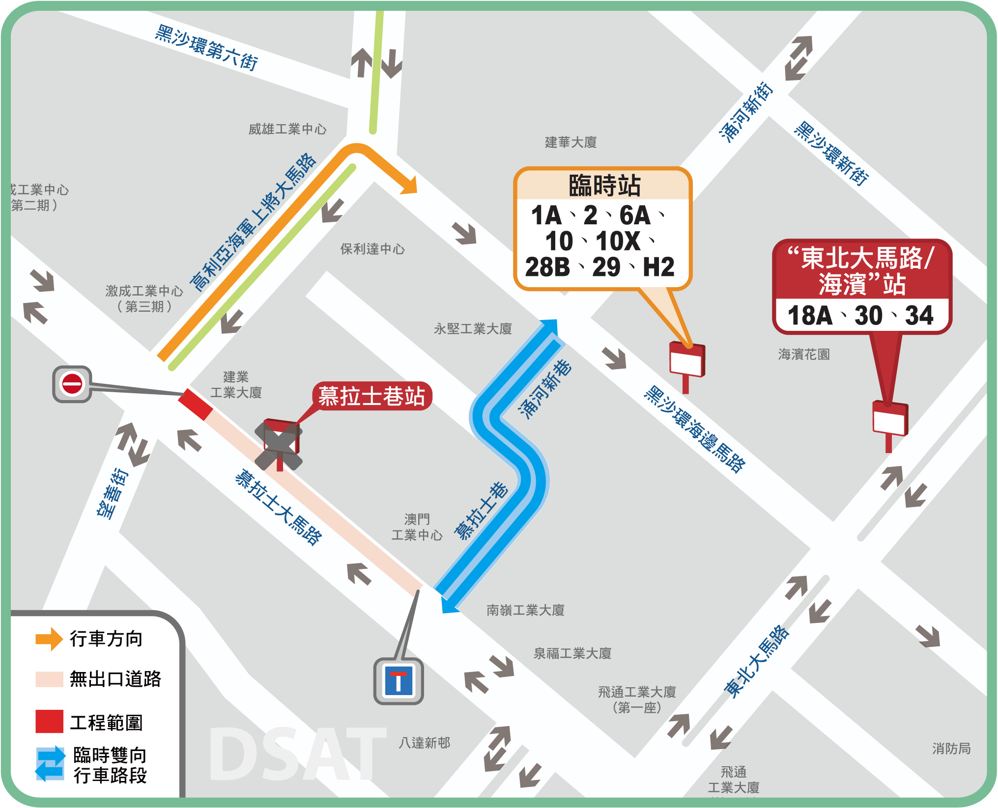 因應上述臨時交通安排,來自慕拉士大馬路之車輛屆時不能直接前往東北大馬路,須取道高利亞海軍上將大馬路經黑沙環海邊馬路交界之新增臨時路口繞道前往。